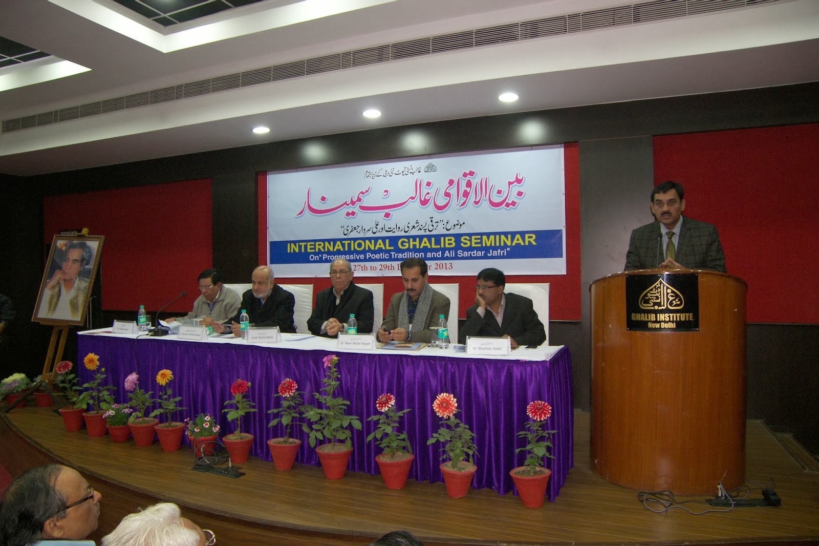 غالب انسٹی ٹیوٹ کے زیراہتمام بین الاقوامی غالب سمینار جو’’ترقی پسند شعری روایت اور علی سردار جعفری‘‘ کے موضوع پر منعقد کیاگیاہے کہ اُس کے دوسرے دن کے پہلے اجلاس میں مشہور شاعر جناب مصحف اقبال توصیفی اور پاکستان کے معروف ادیب و دانشور جناب ڈاکٹر مرزاحامدبیگ نے صدارت کی۔ پہلا پرچہ ڈاکٹرعطاء اللہ سنجری کا تھا۔انہوں نے علی سردارجعفری کی شاعری کا تقابل کیرل کے شاعروں سے کیا۔ان میں موجود مماثلت اور اختلافات کودلائل کے ساتھ اجاگر کرنے کی کوشش کی۔ دوسرا مقالہ ڈاکٹرصالحہ ذرّین کا تھاانہوں نے سردارجعفری کی غزلیہ شاعری کے اہم پہلوؤں کی جانب اشارہ کیا۔ جس میں زندگی ،عشق،غم اور اجتماعی معاشرتی کی اصطلاحوں کاخوب خوب استعمال کیا۔ تیسرا مقالہ اردو کے معروف نقاد ابوالکلام قاسمی نے پیش کیاانہوں نے سردارجعفری اور مارکسی جمالیات کوایک نئے زاویہ سے دیکھنے کی کوشش کی۔ سردار جعفری کے یہاں جمالیات کاجو تصور رہاہے اُس سے مارکسی جمالیات کتنی مماثلت رکھتاہے اس جانب انہو ں نے کچھ اشارے کیے۔ چوتھامقالہ قاضی عبیدالرحمن ہاشمی کاتھاانہوں نے سردارجعفری کی تنقید نگاری سے بحث کی۔اس جلسہ کی نظامت ڈاکٹر ممتاز عالم نے کی۔اور مہمانِ خصوصی کی حیثیت سے جناب انیس اعظمی موجود تھے۔
